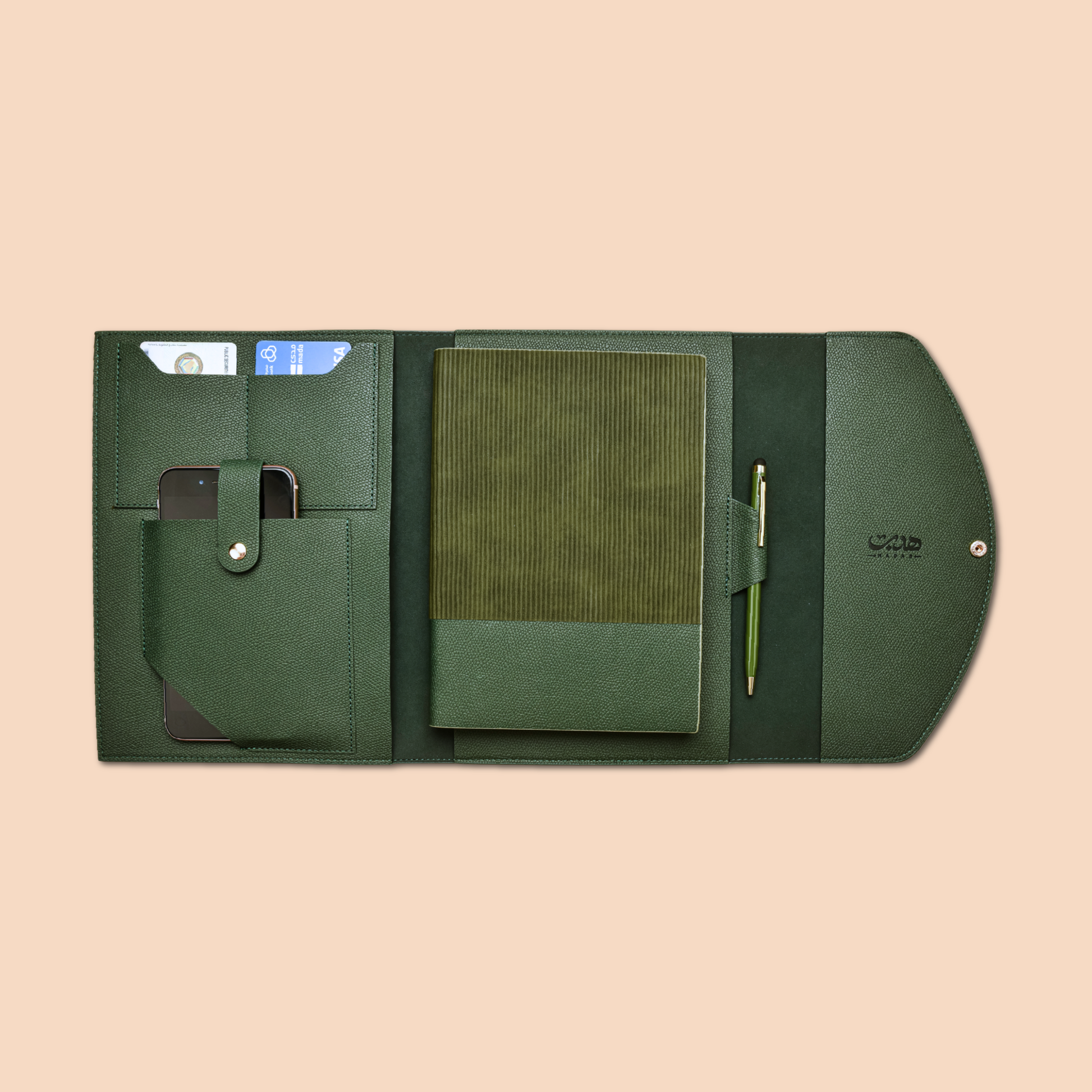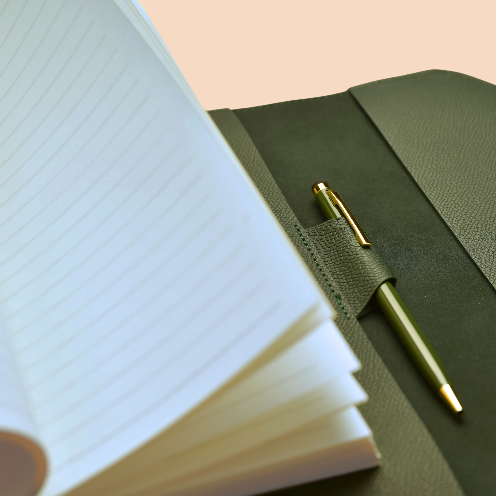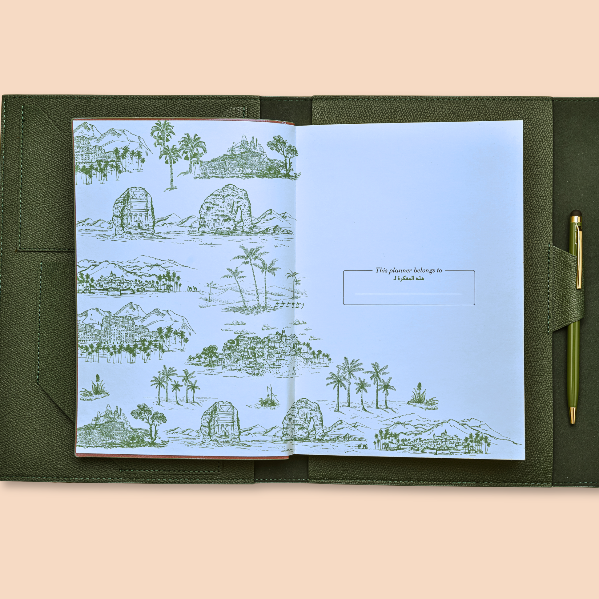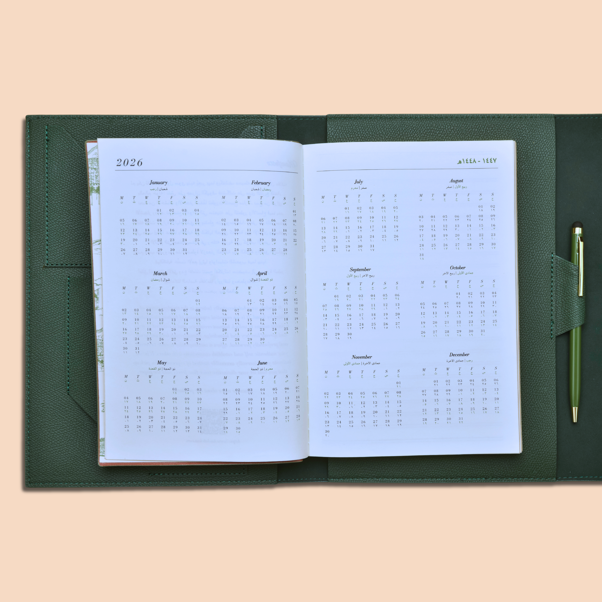 دفتر مقاس A5 مزوّد بصفحة تقويم سنوي لتتبع المواعيد والأهداف.